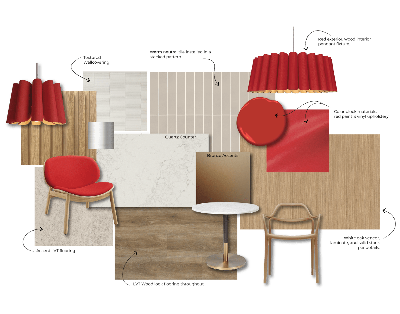 The new space is unapologetically modern, warm, and fully branded—designed for today’s guest and tomorrow’s growth. We analyzed what worked (hello, fresh bakes on the hour) and reimagined the rest to elevate the entire experience. Coffee-colored tones meet natural woods to create warmth and welcome, while stone accents ground the design in timeless café tradition. Branded reds add bold energy, softened by neutral chairs and elegant finishes.